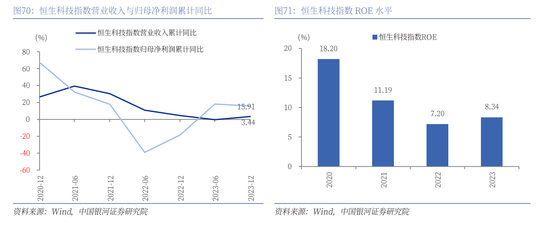 指数层面,以恒生科技指数衡量港股市场创新板块的表现,2023年全年,恒生科技指数营业收入累计同比增长3.44%,相较于2023年上半年的同比下降0.32%有所改善。该指数归母净利润累计同比增长15.91%,自2022年以来已过拐点,整体呈现回暖迹象。从盈利能力来看,恒生科技指数2023年净资产收益率为8.34%,相较于2022年提升了1.14pct。