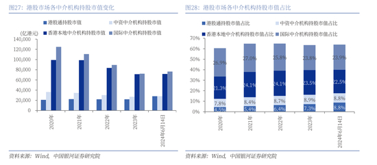 从占比来看,截至6月14日,中介机构持股市值占港股总市值的比例由2023年末的63.5%提升到64.0%。其中,港股通和国际中介机构持股市值占比上升,而香港本地中介机构和中资中介机构持股市值占比有所下滑。