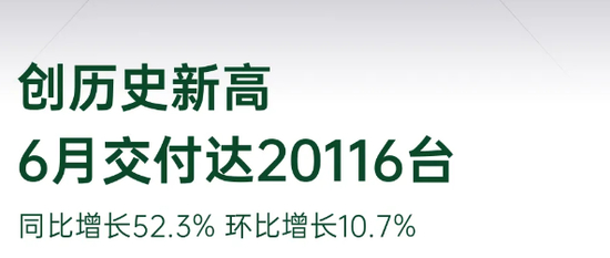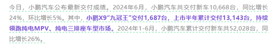 以小鹏汽车为例,该公司在6月交付1.06万台,同比增长24%,环比增长5%;2024年上半年交付5.2台,同比增长26%。