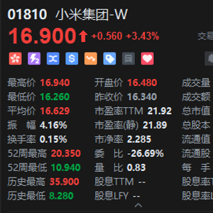 7月17日消息,港股小米集团涨超3%,报16.9港元,成交额6.38亿港元,总市值4219.69亿港元。