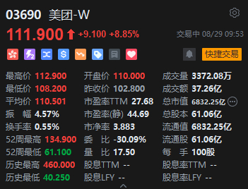 8月29日消息,港股美团涨近9%,报111.9港元,成交额37.26亿港元,总市值6832.25亿港元。