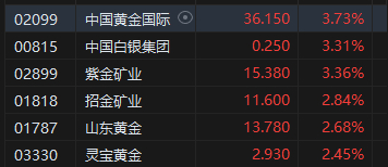 11月19日消息,港股黄金股集体高涨,中国黄金国际涨近4%,紫金矿业涨超3%,招金矿业、山东黄金涨超2%。
