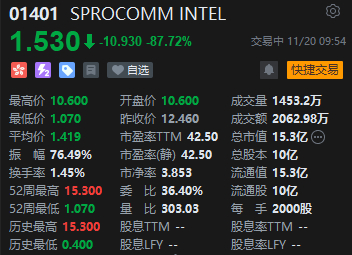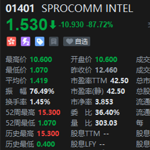 11月20日消息,港股SPROCOMM INTEL暴跌87.72%,报1.53港元,成交额2062.98万港元,总市值15.3亿港元。