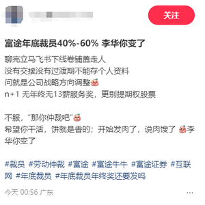 11月20日消息,有网友爆料,富途年底裁员40%-60%,该网友表示,“聊完立马下线,卷铺盖走人;没有交接、过渡期,问就是战略方向调整;n+1无,年终无”。评论区有网友指出甚至裁了不少应届生。