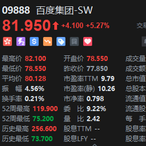 11月26日消息,百度集团涨超5%,报81.95港元,成交额近5亿港元,总市值2298.88亿港元。