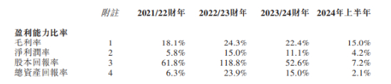 更令人担忧的是毛利率的持续下滑态势。2021/22财年、2022/23财年、2023/24财年、2024年上半年,公司的毛利率分别为18.1%,24.3%,22.4%,15%。由此可见,自2022年起毛利率逐年下跌,至2024年上半年更是骤降7.4个百分点。