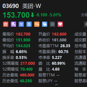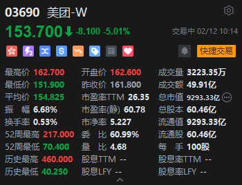 2月12日消息,港股美团大跌逾5%,报153.7港元,成交额近50亿港元,总市值9293.33亿港元。