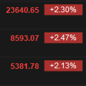 5月14日消息,港股三大指数高开高走,截至收盘,恒生指数涨2.30%,报23640.65点,恒生科技指数涨2.13%,国企指数涨2.47%。盘面上,科网股全线上涨,百度集团涨超4%,阿里巴巴、京东集团、小米集团涨超3%,腾讯控股涨近3%;航运及港口板块多股大涨,中远海发涨超12%;中资券商股全线走强,弘业期货一度涨超25%;互联网医疗股齐涨,京东健康涨超5%。