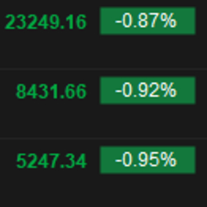 今日港股三大指数集体低开,恒生指数跌0.87%,报23249.16点,恒生科指跌0.95%,国企指数跌0.92%。盘面上,科网股普遍下跌,阿里巴巴跌超6%,美团、百度集团跌超2%,快手等跌超1%,网易涨超10%;黄金股普涨,赤峰黄金涨超3%;机器人概念股分化,第四范式涨超4%。