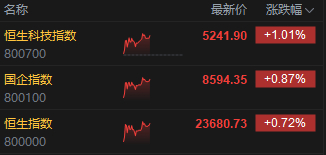 6月4日消息,港股三大指数低开高走。截至午间收盘,恒生指数涨0.72%,报23680.73点,恒生科技指数涨1.01%,国企指数涨0.87%。盘面上,科网股普涨,美团涨超4%,小米集团、阿里巴巴、百度集团、快手涨超1%;核电股集体飙升,中广核矿业大涨超24%,中核国际涨超10%;创新药概念走强,信达生物大涨超15%,再鼎药业涨超10%;港股稳定币概念股持续走高,联易融科技涨超17%,中国光大控股涨超15%,连连数字涨超6%。
