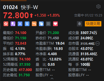 7月22日消息,快手股价开盘一度涨超3%,7月以来累计涨幅超14%。
