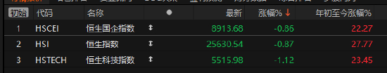 12月31日消息,港股2025年最后半个交易日,三大指数低开低走,截至收盘,恒生指数跌0.87%,报25630.54点,恒生科技指数跌1.12%,国企指数跌0.86%。今日港股盘面上,科网股跌多涨少,百度涨超1%,网易跌超3%,京东、美团、阿里巴巴、快手跌超1%;汽车股高开低走,零跑汽车跌超2%;半导体板块回调,中芯国际跌超1%;航空股涨幅居前,南方航空涨超4%;影视股活跃,大麦娱乐涨超5%。