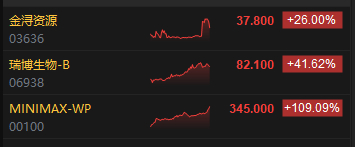 今日三只新股上市,瑞博生物-B涨超41%,MINIMAX涨超109%,金浔资源涨超26%。