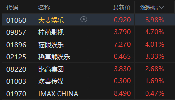 影视股涨幅居前,大麦娱乐涨超6%。据灯塔专业版,截至1月9日,2026年1月总票房(含预售)已突破10亿。光大证券指出,随着《飞驰人生3》率先定档,公众对春节档的关注与讨论持续升温。从目前已释出的片单来看,2026年春节档整体热度或难以达到2025年同期水平,但凭借多位具有市场号召力的导演及主演阵容,26年春节档票房表现仍具备一定保障。
