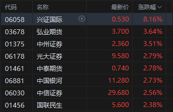 中资券商股普涨,兴证国际涨超8%。美银证券认为,内地政府对资本市场的承担,以及长期资金流入股市,货币宽松、存息不吸引,以及监管机构对融资及A股IPO的放宽,都支持券商今年盈利及ROE轨迹。同时,领先券商持续离岸扩张将增加经营杠杆及盈利能力上行空间,展开新扩张及成长周期。行业整合持续,先行者料受惠协同效应及市占扩张。