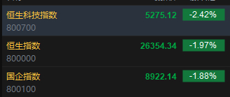今日港股三大指数集体低开,恒指开盘跌1.97%,报26354.34点,恒科指跌2.42%,国企指数跌1.88%。盘面上,科网股普跌,百度集团跌超4%,快手、阿里巴巴跌超3%;黄金股普跌,紫金矿业跌超5%;芯片股走弱,华虹半导体跌超3%。今日三只新股上市,大族数控涨超10%、卓正医疗涨超35%。