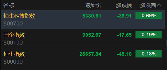 今日港股三大指数集体低开,恒指开盘跌0.18%,报26657.84点,恒科指跌0.69%,国企指数跌0.19%。盘面上,科网股普跌,阿里巴巴、哔哩哔哩跌超3%,百度跌超2%;有色金属板块活跃,中国黄金国际涨超2%;石油股普涨,中海油涨超2%;汽车股走弱,理想汽车跌超1%。