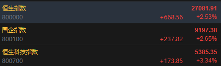 2月13日消息,港股三大指数集体上涨。截至收盘,恒生指数涨2.53%,报27081.91点,恒生科技指数涨3.34%,国企指数涨2.65%。盘面上,科网股普涨,美团、百度跌超3%,哔哩哔哩、阿里巴巴跌超2%,联想涨超2%;贵金属板块领涨逻辑清晰,潼关黄金涨超12%;锂电池逆势走强,赣锋锂业涨超8%;智谱跌超22%。