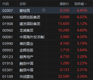 内房股活跃,碧桂园涨超6%。天风证券发布研报称,受春节假期因素影响,房地产供需两端均进入传统淡季,30大中城市商品房成交面积季节性回落。节前1月的地方两会部署“稳楼市”政策,多地明确表示将着力稳定房地产市场、推进城市更新,从稳市场和优存量两方面发力,节后重点关注2月下旬地产销售回暖节奏及3月上旬全国两会的房地产政策定调。