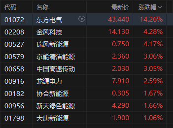 风电股强势,东方电气涨超14%。东吴证券发布研报称,AI算力爆发,美国电力供应缺口扩大,电源需求大增,CSP厂商下场自建电源,首选燃气轮机、其次为光储,中国企业将受益于美国电源建设高景气。重点推荐燃气轮机整机核心标的东方电气,并关注海联讯、哈尔滨电气、上海电气等。