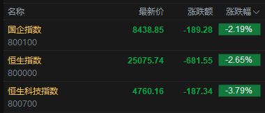 今日港股三大指数集体低开,恒指开盘跌2.65%,报25075.74点,恒科指跌3.79%,国企指数跌2.19%。盘面上,科网股普跌,百度跌超6%,快手、哔哩哔哩跌超5%,阿里巴巴、网易跌超4%,京东、腾讯、美团、联想跌超3%;油气股大涨,中石油涨超7%,山东墨龙涨超14%;芯片股普跌,华虹半导体跌超6%;电力设备股低开,东方电气跌超7%;黄金股普遍下跌,中国黄金国际跌超5%;今日三只新股上市,埃斯顿平开、兆威机电涨超9%、优乐赛共享跌超31%。
