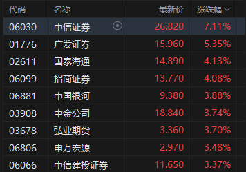 中资券商股走高,中信证券涨超7%。中信建投发布研报称,三重边际变化向好,2026证券板块业绩超预期值得期待。上半年交投活跃度同比大增趋势确立,全年增长或超预期;年初新开户数据亮眼,散户增量资金蓄势待发;券商发债融资规模边际大幅扩张,有望驱动杠杆提升、突破行业ROE高点。
