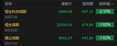 今日港股三大指数集体低开,恒指开盘跌1.82%,报25550.56点,恒科指跌2.1%,国企指数跌1.62%。盘面上,科网股普跌,腾讯哔哩哔哩跌超4%,快手、阿里巴巴跌超3%,网易、京东跌超2%;油气设备与服务股高开,山东墨龙涨超14%;AI应用股部分回调,Minimax跌超5%;芯片股普跌,天数智芯跌超4%;黄金股低开,紫金黄金国际跌超4%。