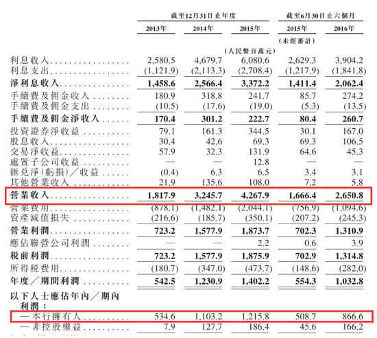 对比2014年分别高达78.5%及103.1%的按年营收以及净利润增长,2015年该行的营收及净利润按年增速分别为31.2%及10.2%,增长大为放缓。但到2016年上半年,该行营收及净利润按年增速分别录得59.1%及70.4%,重回高速增长轨道。