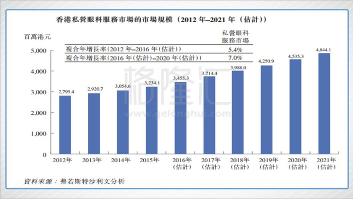 每年香港医疗市场的医疗支出都在稳步上升中,2016年的医疗支出已经达到1044亿港元,2012~2016年的复合年增长达到7.5%,预计到2021年医疗支持总额会达到1782亿港元。其中香港私营眼科服务市场的规模从2012年的27.95亿港元增加到2016年的34.55亿港元,复合年增长率为5.4%。由于老龄化不断增加,2015年统计的香港的65岁以上的人口已经达到112万(总人口的15.3%),白内障、视网膜脱落及青光眼这样老年人常见眼科疾病也会不断增加,所以预计到2021年私营眼科的市场规模将达到48.44亿港元。