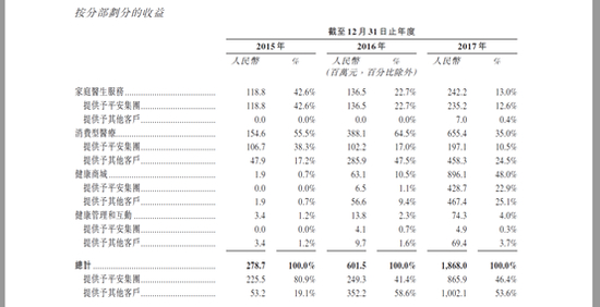 根据招股书的披露,“家庭医生”提供医疗在线咨询,由人工智能辅助自有医疗团队及外部医生完成;消费型医疗业务包括健康检查和基因检测、美容护理、口腔卫生服务等,同时向个人及企业销售体检计划;健康商城即电子商务业务,提供医疗产品(如药品、保健品、中药)、医疗器械、健身产品等。