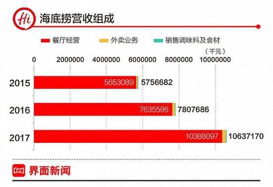 在招股书中,海底捞披露了其经营数据和增长率,2017年海底捞营收总额为106.37亿元,收益由2015年的57.57亿元按35.9%的复合年增长率增至2016年的78.08亿元,并进一步增至2017年的106.37亿元;而年度利润由2015年的4.12亿元增至2017年的11.94亿元,复合年增长率为70.5%。