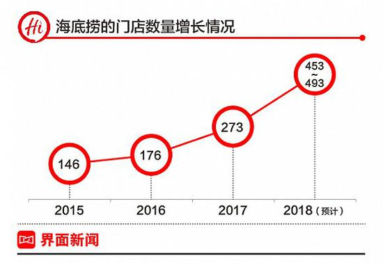 海底捞计划将于2018年新开453-493家店,而目前海底捞总共有320家店,其中296家在内地。招股书中并没有明确2018年新开的店将会在海内外如何分配,但我们假设同样为9成在国内,将开在国内的新店也将超过400家——即海底捞在国内的门店数量将在2018年翻番。
