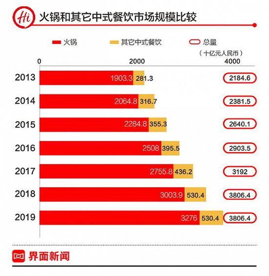 根据弗若斯特沙利文的统计,整个餐饮行业中,火锅餐厅的收入从2013年的2813亿人民币增加至2017年的4362亿,复合年增长率为11.6%。预计2017-2020年将持续按照10.2%的速度增长,是中式快餐中增长最快的部分。