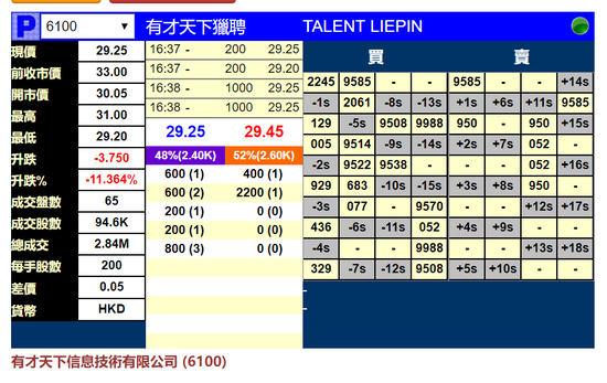 新浪港股讯 6月28日消息,猎聘网母企有才天下猎聘明日上市,今日暗盘大跌11.36%,报价29.25港元,相当于一手浮亏750港元。