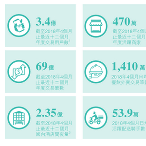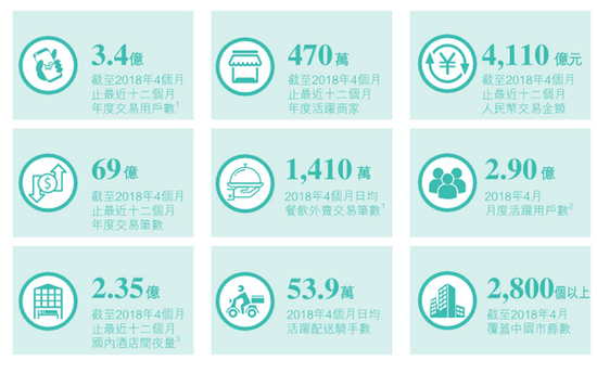 截至2018年4个月止最近十二个月人民币交易金额4110亿元,2018年4个月止最近十二个月年度交易笔数69亿。2018年4个月日均餐饮外卖交易笔数1410万,活跃配送骑手53.9万。