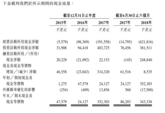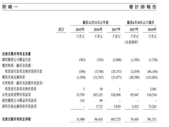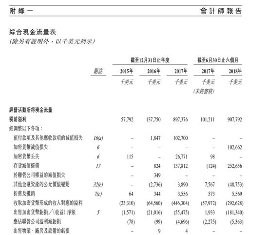 招股书显示,近年来一直盈利的比特大陆,在现金流表中的经营性现金流一直为负,原因是因为加密货币收入无法计入经营性现金流,只能计入投资活动所得现金流。2017年,比特大陆出售加密货币所得款项超过5亿美元;今年上半年同样超过5亿美元。
