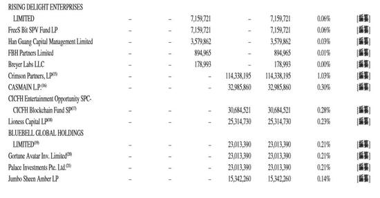 在机构投资者,其中SCC开头的股东均为红杉全资持有的投资基金,红杉资本共持有比特大陆3.14%股权,创新工场(李开复)通过Sinavation Fund 在A轮入场,持有比特大陆1.13%股权,IDG 持有比特大陆0.02%股权,淡马锡总计持有比特大陆 0.35% 股权,新加坡经济发展局旗下投资机构 EDB Investments 持有 0.11%,北京市集成电路产业国际基金持股 0.07%。