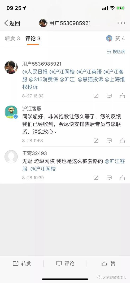 想到这里,我真是气不过,去网上搜了下,好多网友都和我有同样遭遇。同时我也查到沪江网校竟然也要作为“独角兽”要在港交所上市了,估值还超过70亿,真是心中一万头羊驼跑过...于是7月份的时候我写了篇微博把我的经历简单记录并@315@cctv等投诉了一下,希望能有更多的人能看见。