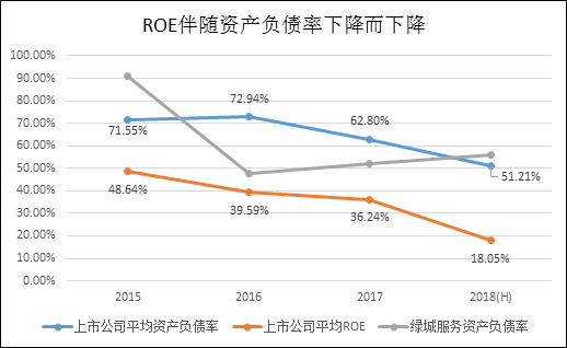 物业管理公司多是轻资产、高杠杆的,绿城服务公司近几年的资产负债率如下图所示,随着上市融资完成后,公司的资产负债率从90%以上的高位下降至50%左右的水平。与高负债率相对应的是较高的ROE水平,2015年公司的净资产收益率达116%,而2017年的资产负债率降低至21.3%。随着物业管理公司上市融资,行业整体的资产负债率逐步下降,ROE也随之下降。