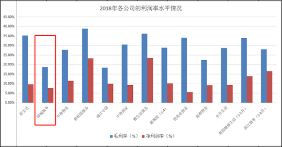 2018年上半年,基础物业管理服务与增值服务占比分别为68.85%、31.15%,两项业务的毛利率为11.2%、35.3%。绿城服务今年上半年的毛利率与净利润率相对于其他公司来说,处在中下游水平,如下图所示。2015、2016、2017也是一样。