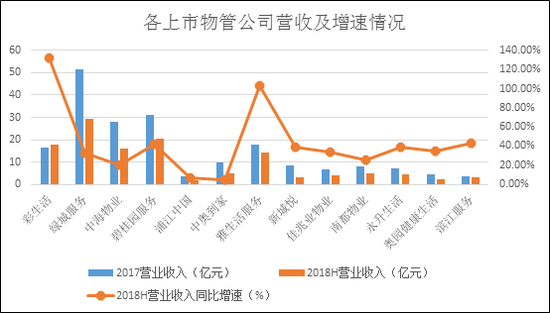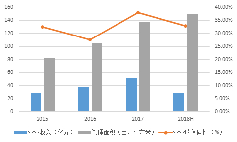 公司招股说明书及近几年财报数据显示,自2015 年来,公司发展较快,营业收入从2015年的29.23亿元增长到2017年的51.42亿元,2018年上半年更是达到了29.28亿元,与2015年全年营收相当,同比增长32.88%。截止今年上半年,公司在全国130个城市总计管理建筑面积达1.5亿平方米,项目数为1095个。其中以住宅项目为主,收入占比方面,住宅收入占比从2015年的74.8%略有下降至2018年的69.1%。