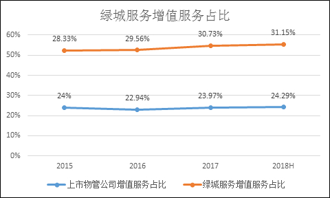 公司增值服务占比也处在上市物管公司前列,2018年上半年增值服务收入占比达31.15%,位列第5,同期行业平均水平为22.94%。近几年的增值服务收入也以较快的速度增长。从2015年的28%逐渐上升到2018年的31.15%。