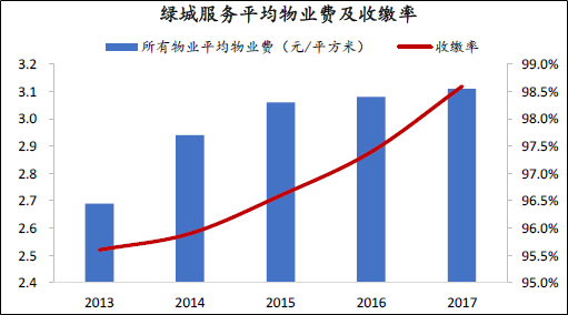 截止2018年6月,公司平均物业管理费用为3.13元/月/平方米,自2015年以来,绿城服务的平均物业管理费从3.06元/月/平方米上升至2018年的3.13元/月/平方米。与较高物业费相匹配的是公司物业费收缴率的提升,2017年中国指数研究院统计数据显示,百强物管企业的平均收缴率为94.14%,其中住宅收缴率均值为91.97%。而绿城服务以住宅业务为主,公司的物业收缴率始终在行业之上,并且逐年稳步提升,2017年,收缴率达到98.6%,如下图所示。