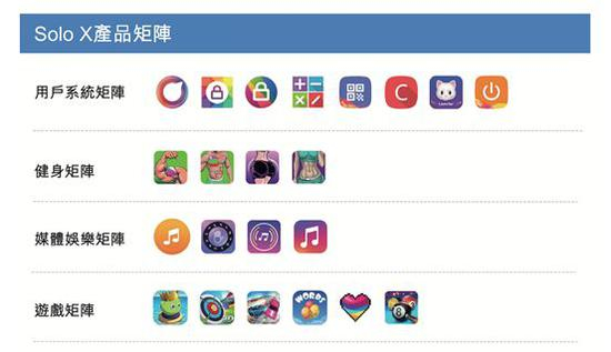 细分而言,Solo X产品矩阵共分为用户系统矩阵、媒体娱乐矩阵、健身矩阵、游戏矩阵等四个子矩阵,包括启动器、安全、防病毒、音乐、娱乐、健身、休闲游戏等多个品类,譬如Solo Launcher、Solo Locker、Archery Champ等。