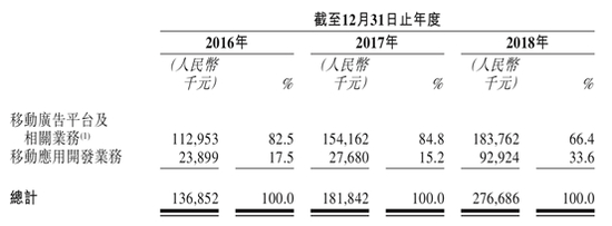 从收入结构来看,移动广告平台及相关业务主要通过向广告主提供全面的广告平台及相关服务产生收入,截至2016年、 2017年和2018年12月31日止年度,这部分的收入占比分别为82.5%、84.8%和66.4%。