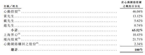 上海界心持有10.43%;境内股东持有21.71%;心动网络购回股份占2.34%。