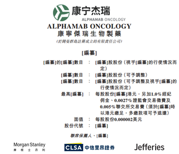 中国领先临床阶段生物制药公司,康宁杰瑞生物制药-2019年7月15日向港交所提交港股上市申请,联席保荐人为摩根士丹利、中信里昂证券及Jefferies。