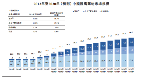 中国肿瘤药物市场按所示期间的历史及预测市场规模(按各类疗法的销售额计)。按销售额计算,中国肿瘤药物市场从2013年的162亿美元增至2018年的234 亿美元,预计2030年将达到607亿美元,从2018年起计的年复合增长率为8.3%。单抗为增长最快的疗法类型,自2018年至2030年的年复合增长率为18.1%。