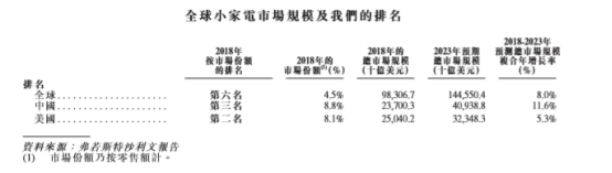 根据弗若斯特沙利文报告显示,以市场份额计算,JS环球生活于2018年在小家电企业中分别排名全球第六和中国第三。其中,破壁机、食物料理机在中国市场排名第一,吸尘器在美国排名第一,扫地机器人、蒸汽拖把和多功能烹饪煲在美国排名第二。