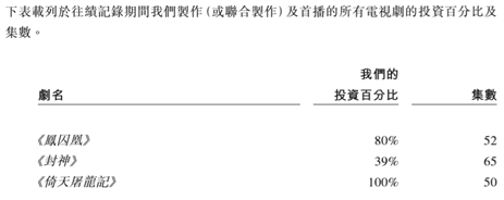 据公司披露,往绩记录期间集团影视制作及首播的电视剧为《封神》、《凤囚凰》及《倚天屠龙记》。